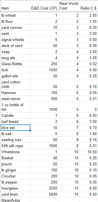 When playing D&D, I’ve always had a hard time with contextualizing gold. On the one hand, some things seem simple, like a mug of ale being 4cp (Copper pieces), and at my local bar I can get a beer for about $4. Okay, so a copper is worth a dollar. But then, I’ll see a spyglass for 1000gp, or $100,000! What the heck?? A book is $2500? What is going on here?