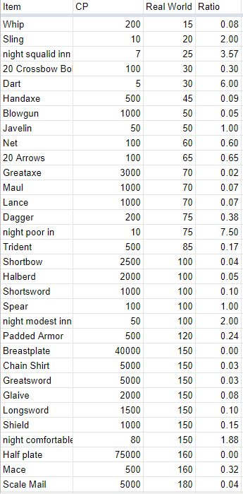 So, I crunched the numbers. I took a look at everything on the equipment and lifestyle pages, and I found the real world equivalent. I brought all the prices down to Copper, to convert it easily, and started to see how much money a Copper piece was worth.