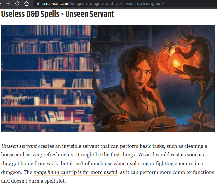 In the context of monster killing, I think I can agree that the spell Unseen Servant is relatively useless. It does wonders for roleplay, but there is no part of Combat or Exploration that I can see using this spell in any meaningful way, that the Cantrip Mage Hand couldn’t take care of.